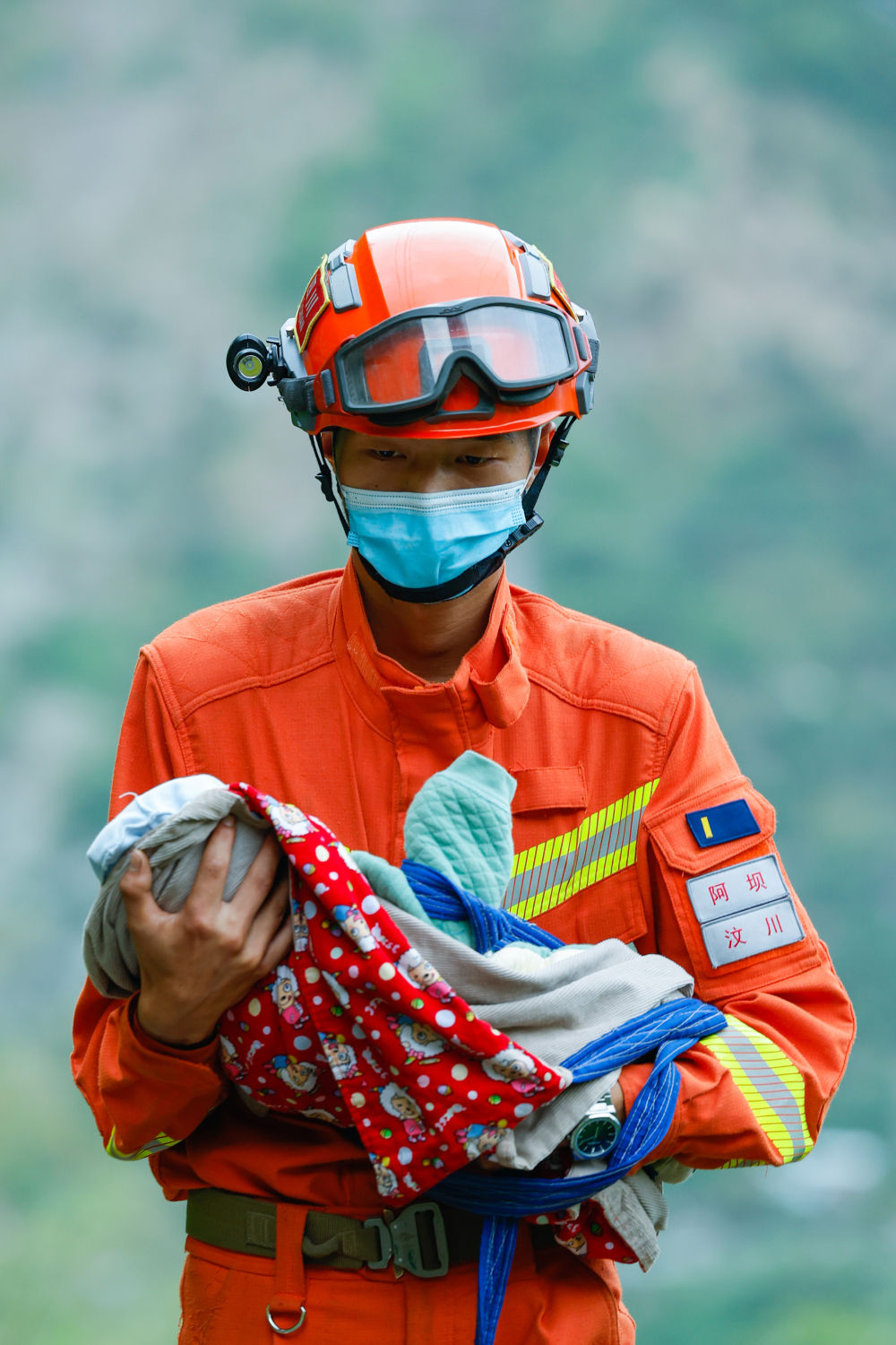 我一路小跑到消防員前面一段距離,拿起帶著長焦鏡頭的相機(jī),蹲下,拍攝,再向前跑一段,再蹲下,再拍攝。經(jīng)歷了一天差不多10個(gè)小時(shí)的徒步、拍攝,此時(shí)我的體力確實(shí)有些跟不上,為了保證能把這個(gè)場景拍好,只能多拍一些,不留遺憾。消防員沿著土路折了幾道彎才走到聯(lián)合村隧道口的大路,把嬰兒交給值守在那里的瀘定縣人民醫(yī)院的醫(yī)護(hù)人員。此時(shí)我才有時(shí)間和他簡單聊了聊。他叫張自立,來自阿壩森林消防支隊(duì)汶川大隊(duì),2個(gè)月大的嬰兒來自重災(zāi)區(qū)灣東村。經(jīng)過包括新華社、人民日報(bào)、央視等媒體對這張照片的傳播,他第二天就成了大家口中的“汶川哥哥”。