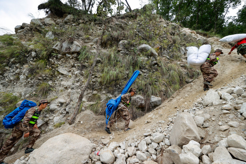 一路上,不斷遇到民兵和村民背著帳篷、棉被等物資上來。一個(gè)救災(zāi)帳篷要被拆分成四部分,每部分都是好幾十斤,每個(gè)人負(fù)責(zé)一部分才能將一頂救災(zāi)帳篷背上山。困在山上的村民能有避風(fēng)雨的地方住,全靠這人力搭起的不間斷的供給線。