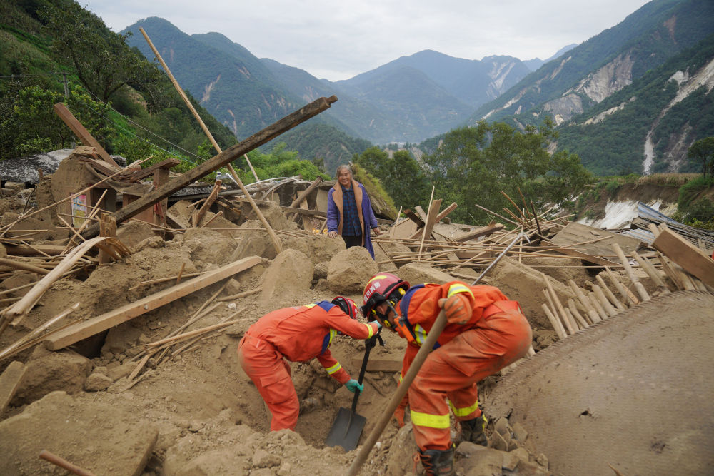 經(jīng)過3個(gè)多小時(shí)的攀爬,終于抵達(dá)紅花崗。村民們的房子倒塌嚴(yán)重,有的房頂直接砸在了地上。稍事休息,我和救援人員沿著公路向山下的灣東村繼續(xù)行進(jìn)。這條公路被塌方損毀較為嚴(yán)重,石頭、泥土、被帶下來的粗壯樹木橫亙在道路中央,有時(shí),甚至整個(gè)路段都被掩埋、下沉。