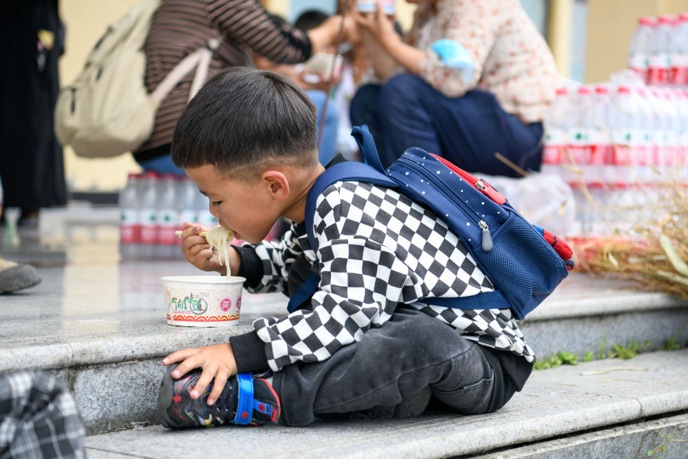 采訪當(dāng)天,這個(gè)安置點(diǎn)里的伙食團(tuán)依舊承包了在場所有村民、救援人員以及采訪隊(duì)伍的午飯,大家依次排隊(duì)領(lǐng)取,補(bǔ)充體力。一旁的草科鄉(xiāng)中心小學(xué)內(nèi),118名孩子也享用著熱氣騰騰的午飯。