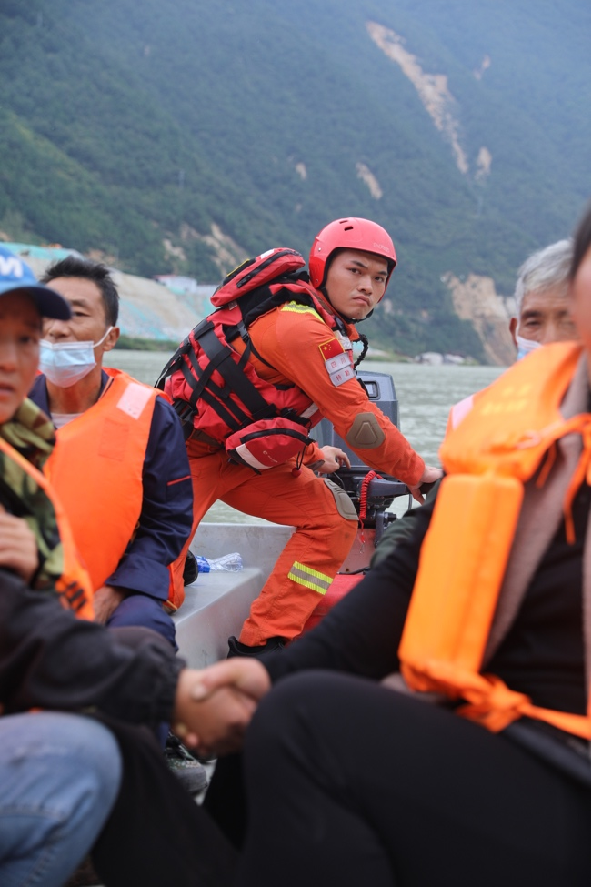 石棉縣王崗坪彝族藏族鄉(xiāng)幸福村緊鄰大崗山水庫,有數(shù)百戶居民,9月5日的地震切斷了這里的道路、電力,水力、通訊,成為名副其實(shí)的“孤島”。但是,援助不會因?yàn)槁吠酒h(yuǎn)而缺席,消防救援隊(duì)伍乘沖鋒舟再翻山越嶺終于在6號到達(dá)該處村莊,快速穩(wěn)妥轉(zhuǎn)移被困受傷群眾,幫助村民在被埋的房屋找尋貴重物品,甚至幫村民轉(zhuǎn)運(yùn)養(yǎng)殖的豬。