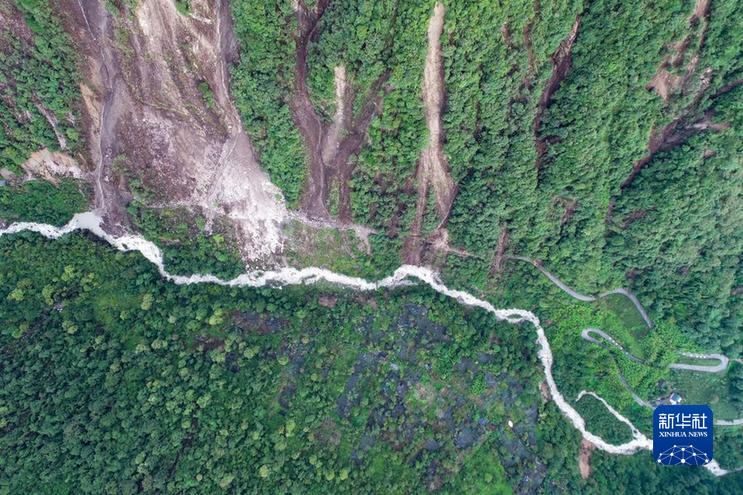 這是9月7日拍攝的海螺溝景區(qū)一號(hào)營地下游處的崩塌災(zāi)害現(xiàn)場(左上部分)(無人機(jī)照片)。新華社發(fā)(四川省冶勘設(shè)計(jì)集團(tuán)有限公司供圖)