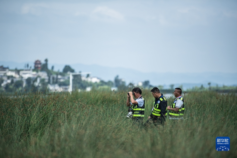 貴州草海國家級自然保護(hù)區(qū),草海巡護(hù)隊副大隊長劉廣惠(左一)和隊員在日常工作巡護(hù)中(2021年7月8日攝)。新華社記者 陶亮 攝