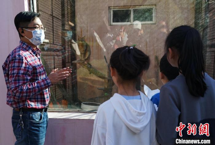 圖為青海野生動(dòng)物救護(hù)繁育中心副主任向?qū)W生介紹荒漠貓。馬銘言 攝