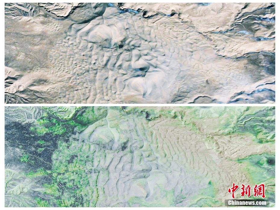 圖為青海省海南州貴南縣黃沙頭2013年(上圖)和2022年(下圖)治理對比。彭璽 供圖
