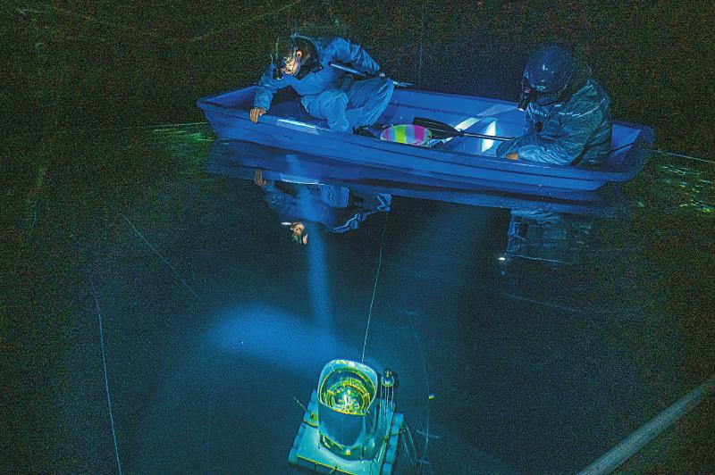 24日,陳明君和同事穿上潔凈服、戴上腳套,劃著小船進(jìn)入伸手不見五指的三號(hào)水池,他們要逐一檢查維護(hù)這里的探測(cè)器單元和電子學(xué)箱。船劃到指定位置,黑暗中陳明君的頭燈光束直射水底,水下碩大的探測(cè)器單元核心設(shè)備——光電倍增管,被照得清晰可見,他和同事一起用“鉤子”把光電倍增管拉起,進(jìn)行檢查?!八乩锏纳疃仁?.5米,這些純凈水的透明度比自來(lái)水高三倍以上,切倫科夫光就從里面捕獲。”陳明君告訴記者。