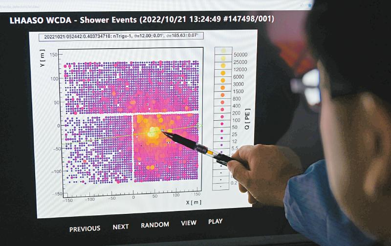 10月21日,科研人員在電腦上展示探測(cè)器的時(shí)間切片,片中顯示的帶顏色的光點(diǎn),顏色越明亮,表明射線能量越強(qiáng)。