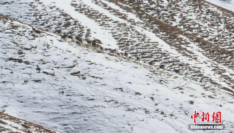 圖為巖羊群在雪地里覓食。 烏蘭縣融媒體中心 供圖