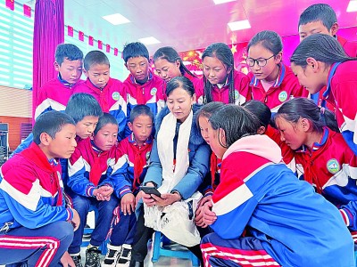 以藍(lán)天為幕布,以學(xué)校為舞臺,即使天氣寒冷也擋不住大家聆聽“精神食糧”的熱情?!斑^去,學(xué)校只有兩排小平房,土坯墻打的黑板,冬天取暖還用干牛糞呢!現(xiàn)在可不一樣了,現(xiàn)代化的教學(xué)設(shè)備、高水平的師資力量,高質(zhì)量的教學(xué)模式,讓牧民們的理念發(fā)生了根本性變化,越來越重視孩子的教育了?!倍泛笏骷乃拗菩W(xué)校長萬瑪項青感慨。