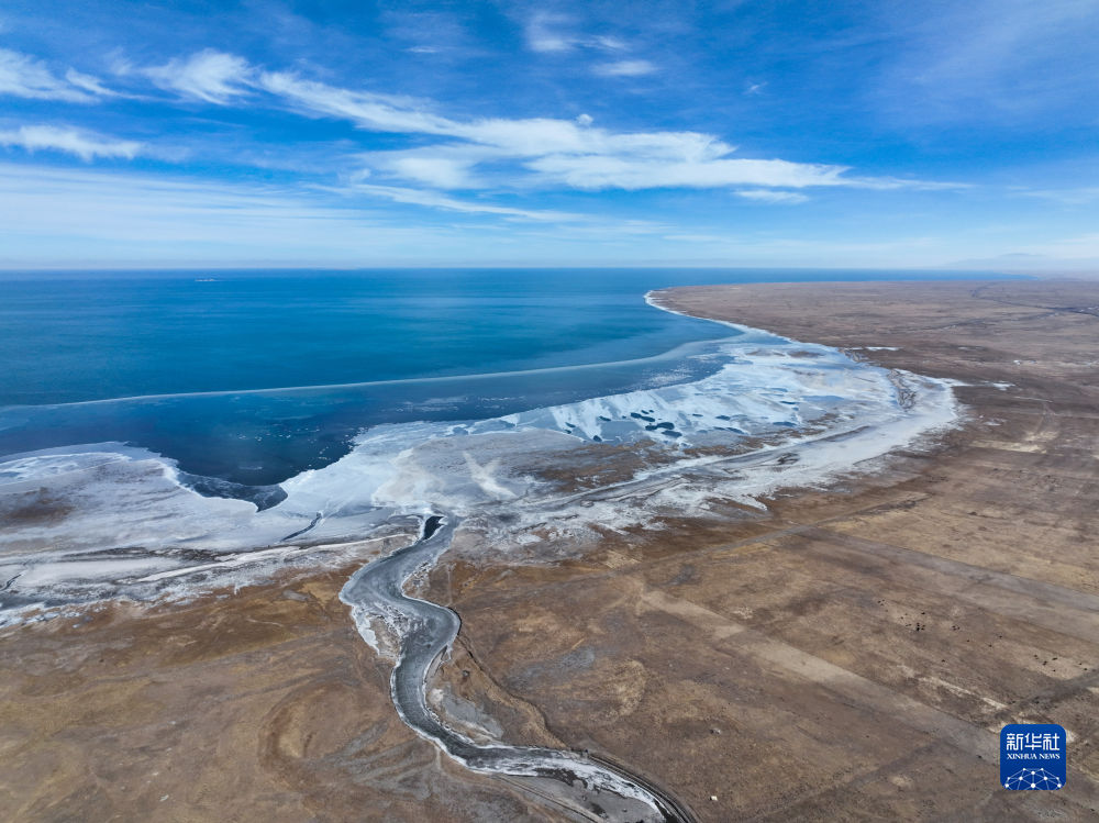 青海湖湖面封凍如破碎“玉帶”