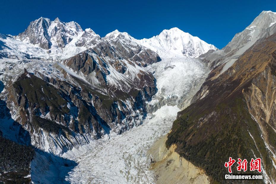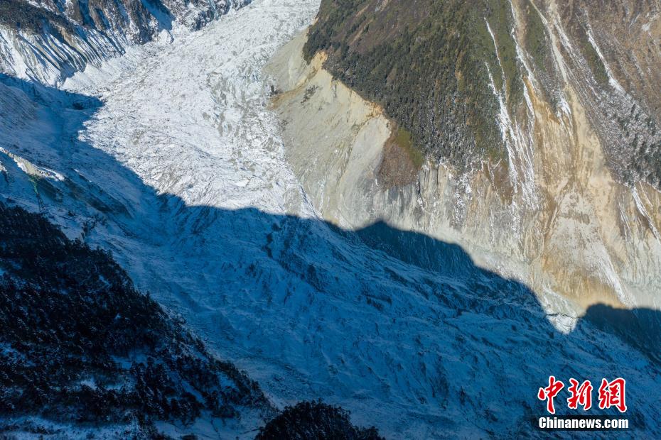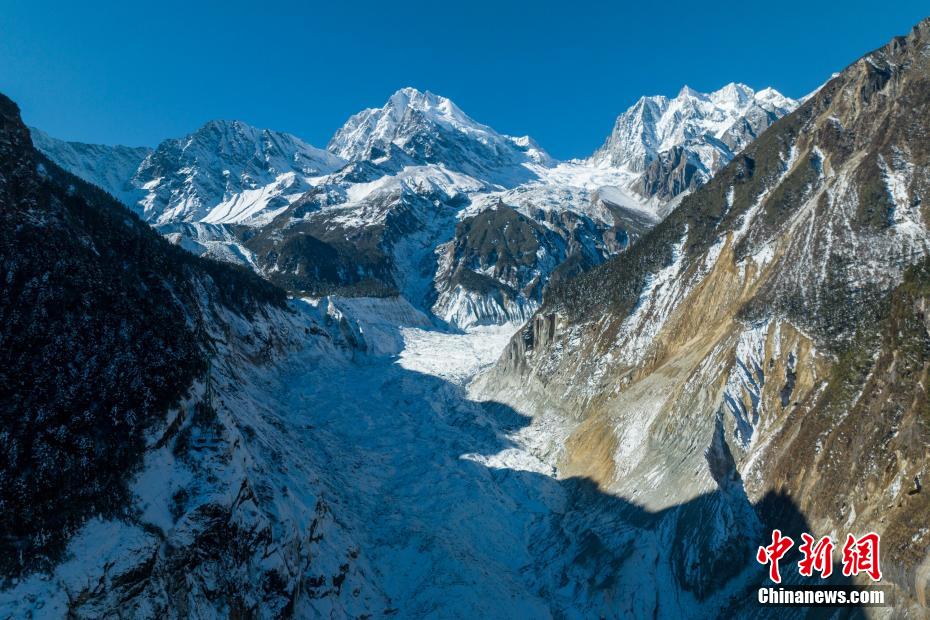 1月9日,中新網(wǎng)記者走進四川瀘定海螺溝景區(qū)核心區(qū),航拍經(jīng)歷了2022年“9.5”瀘定6.8級地震的貢嘎山海螺溝冰川冰瀑布,雄偉壯觀依舊。