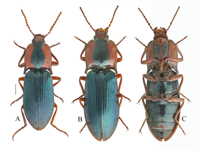 2022年6月17日,綿陽師范學(xué)院團(tuán)隊(duì)來到四川省阿壩藏族羌族自治州黑水縣,開展草原有害生物普查工作。當(dāng)天下午6點(diǎn)過,他們到達(dá)了黑水縣,在蘆花鎮(zhèn)四美村的一條土路旁,一只長相新奇的甲蟲引起了許浩的注意?!八l(fā)現(xiàn)后趕緊叫住我,甲蟲呈現(xiàn)金屬藍(lán)色光澤,在其前胸背板的兩側(cè),都有紅色斑紋,長得特別好看?!鼻聱樥f,“當(dāng)時(shí)初步判斷是一個(gè)金叩甲的物種,但以前從來沒見過?!?/p>