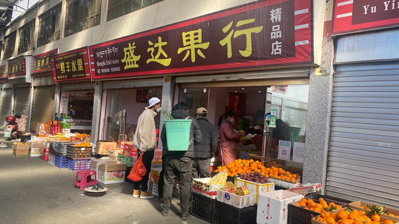 市場內(nèi),記者看到開張的攤位上擺著新鮮的蔬菜、水果、還有鮮肉等,其中生意最好的要數(shù)生鮮店。