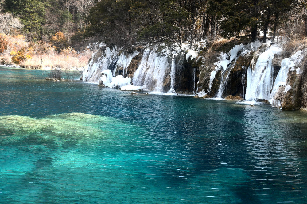 隆冬時(shí)節(jié),在世界自然遺產(chǎn)地九寨溝,皚皚白雪為她披上一身銀裝,淡藍(lán)色的冰瀑也增添了幾分靜謐。冬日陽(yáng)光明媚,川西高原上湛藍(lán)的高山湖泊與白雪交相輝映,讓被譽(yù)為“童話世界”的九寨溝更加迷人。