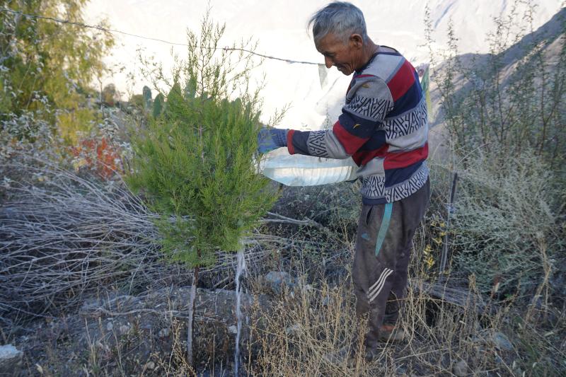 1950年出生在茂頂村木達水村民小組的丁爭,小時候多次看到雨季村里洪水成災(zāi),泥石流橫行,山體滑坡的場景。那時經(jīng)濟落后,村民日子過得苦。丁爭隨母親去頭人家放牛,由于天氣炎熱,饑渴難耐,母親就摘一個頭人家蘋果充饑,被頭人關(guān)了3天3夜。1957年,迪慶發(fā)展迎來新曙光,丁爭家分到了田、牲畜、果樹,當家做主人,從此過上了新生活。2007年,丁爭兒孫滿堂,家務(wù)事不用操心,他就想植樹造林、保護生態(tài),防止山洪暴發(fā)和水土流失,造福子孫后代。于是,他拿著家里的鎬、盆,踏上植樹造林的漫漫長路。 在植樹造林的初期,丁爭老人靠自家的舊桶舊盆給樹苗澆水。隨著旭龍電站、忠態(tài)水庫等項目進場施工,丁爭老人就撿拾一些舊水管、舊鐵絲,把水引到離幼苗最近的地方,以便澆水。用廢棄的鐵絲把樹苗固定好,以免風吹雨打樹苗飄搖致根系斷裂,影響生長。起初由于管理經(jīng)驗不足,澆水困難,1年種100棵樹苗,成活僅幾棵,但他沒有退縮,沒有喪失信心,查找成活率不高的原因,采取相應(yīng)的改進措施,逐年提高了樹苗成活率。