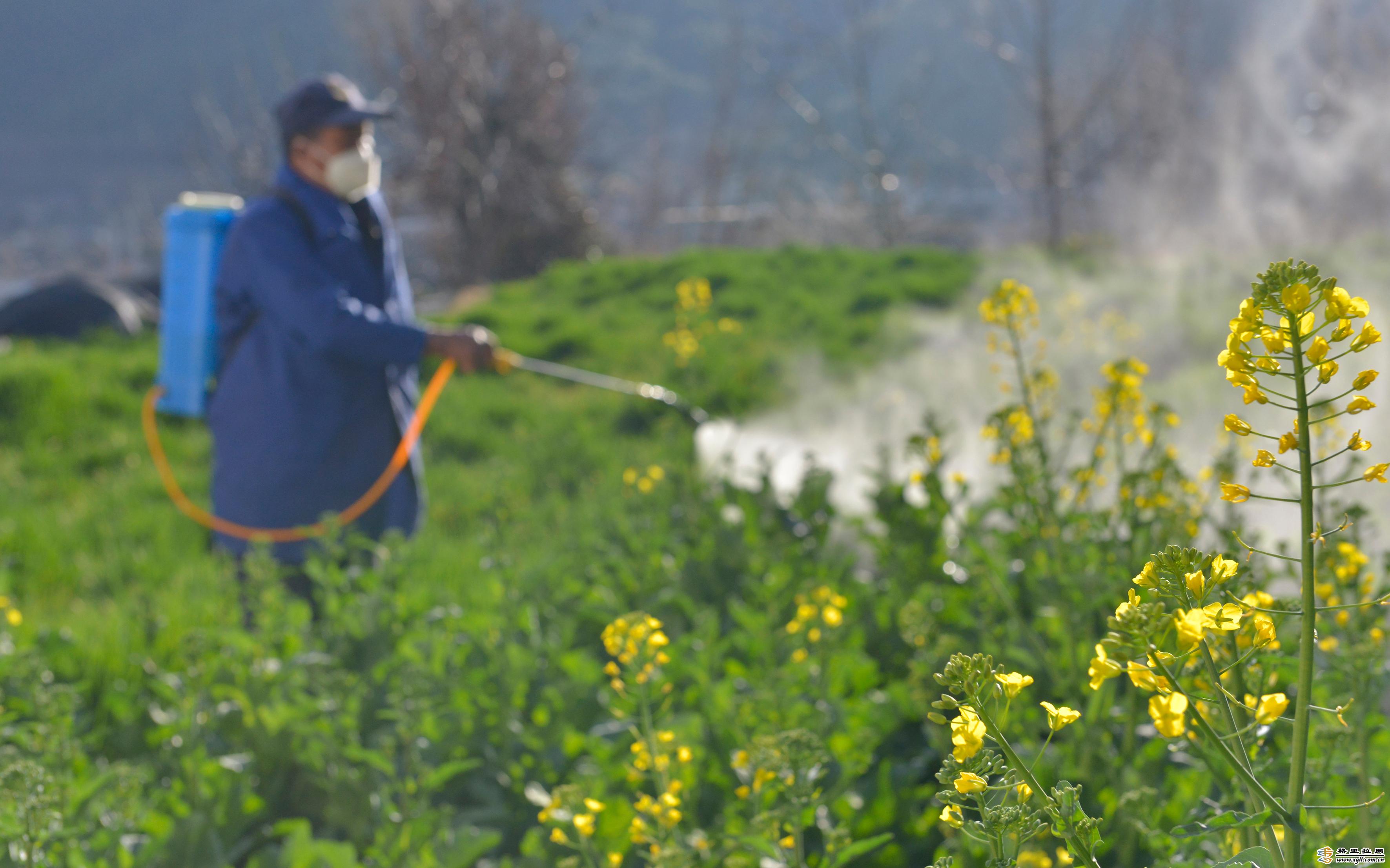 各地農民搶抓農時進行田間管理,圖為香格里拉市金江鎮(zhèn)吾竹村格瓦組村民和麗光在油菜地里噴灑農藥。