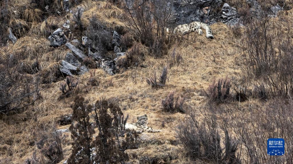 2月21日,在青海省玉樹藏族自治州雜多縣昂賽鄉(xiāng)境內(nèi)的昂賽大峽谷內(nèi),兩只雪豹正在休息。新華社記者 張宏祥 攝