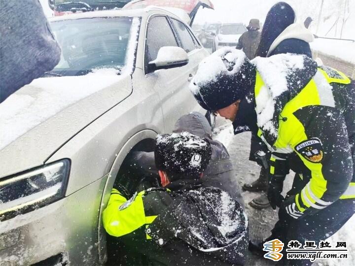 2月22日,大雪使白馬雪山路面積雪結(jié)冰,導(dǎo)致上百輛汽車擁堵滯留,交警冒著嚴(yán)寒疏導(dǎo)交通。