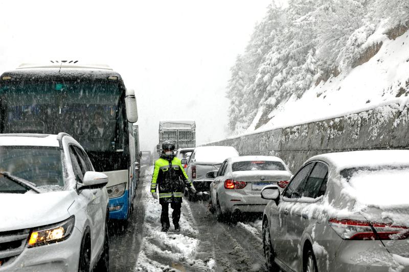 2月22日,大雪使白馬雪山路面積雪結(jié)冰,導(dǎo)致上百輛汽車擁堵滯留,交警冒著嚴(yán)寒疏導(dǎo)交通。[詳細]
