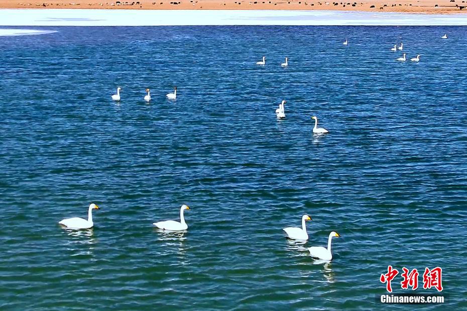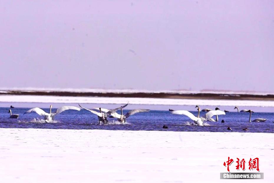 高原初春,在素有“高原藍寶石”之稱的青海湖,記者拍攝到成群大天鵝在湖面上練習(xí)起飛、降落、滑行。青海國家公園觀鳥協(xié)會會長王艦艇介紹,每年3月中旬,在青海越冬的大天鵝都會踏上北遷繁殖路。目前在青海湖的大天鵝多為青海東部黃河流域的“冬候鳥”,在青海湖短暫停留后北遷到夏季繁殖地,在秋末初冬時又會“舉家”回歸來到越冬地。大天鵝屬雁形目鴨科天鵝屬,為國家二級重點保護野生動物,在國內(nèi)主要繁殖于新疆巴音布魯克,主要越冬地有天津及河北沿海、山東榮成和東營、黃河中下游濕地、甘肅、青海、新疆等地。青海湖作為大天鵝的主要越冬地之一,開闊的湖面、涌流的泉水與充足的食物為大天鵝提供了適宜的棲息環(huán)境。