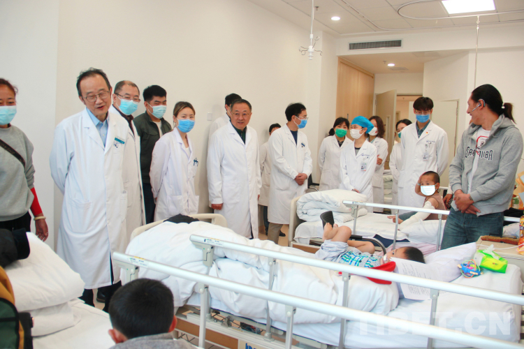 圖為中國醫(yī)學科學院整形外科醫(yī)院院長蔣海越教授(左六),院黨委書記王寶璽教授(左二)等院領導班子成員來到病房看望來自青海果洛的患兒及患兒家屬攝影:劉莉