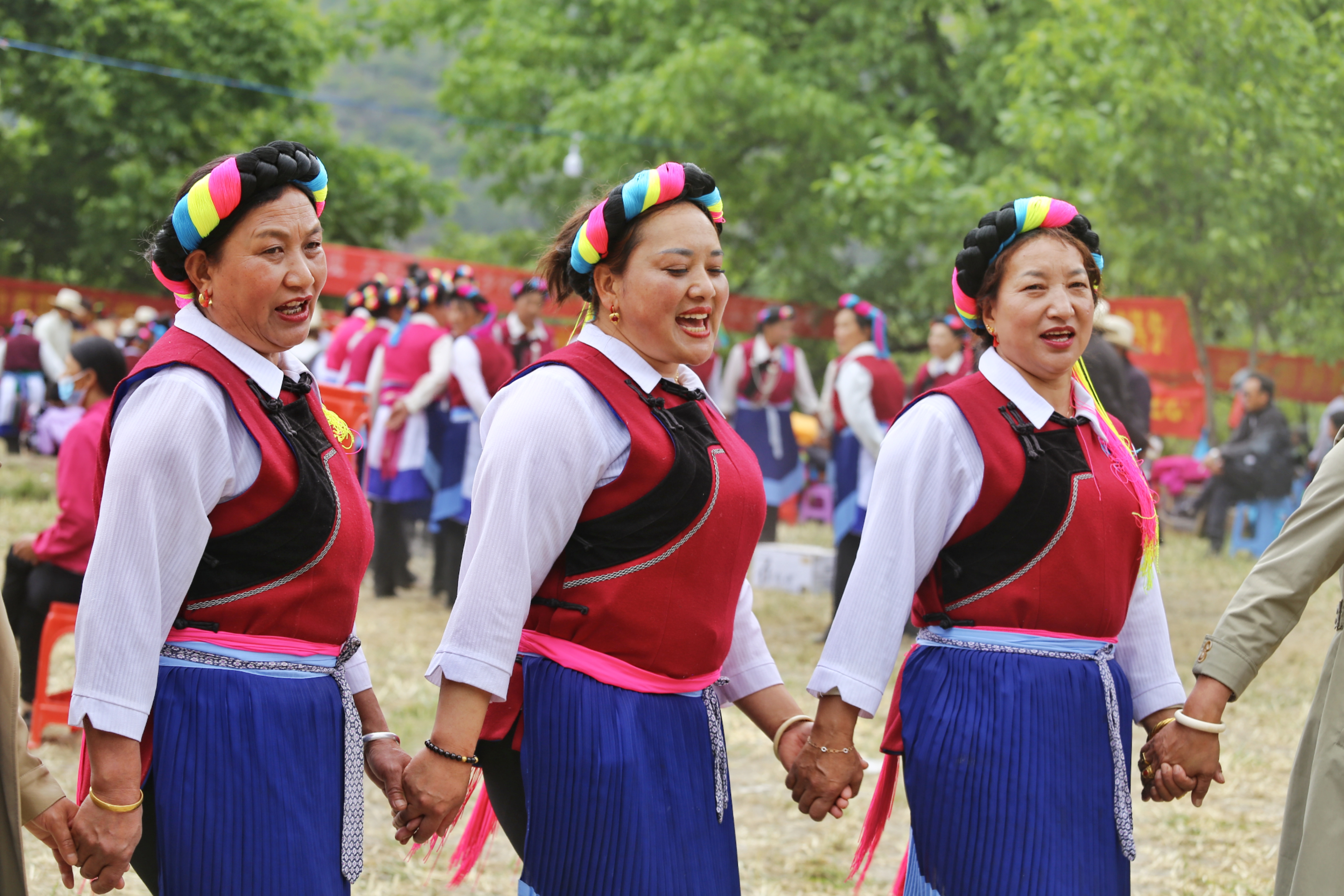 藝術節(jié)開幕式上,《最美的歌兒唱給黨》《傳統(tǒng)熱巴》《編雙草鞋送紅軍》《犁田調》《遇見卓瑪》等節(jié)目向觀眾展示了其宗厚重的文化底蘊和村民生活的變化。伴隨著悠揚的歌聲,“四縣”各族兒女手挽手、肩并肩,圍成同心圓共舞“千人鍋莊”,水袖揮舞,褶裙搖曳,場面壯觀,游客們紛紛拿出手機記錄這場視覺盛宴。