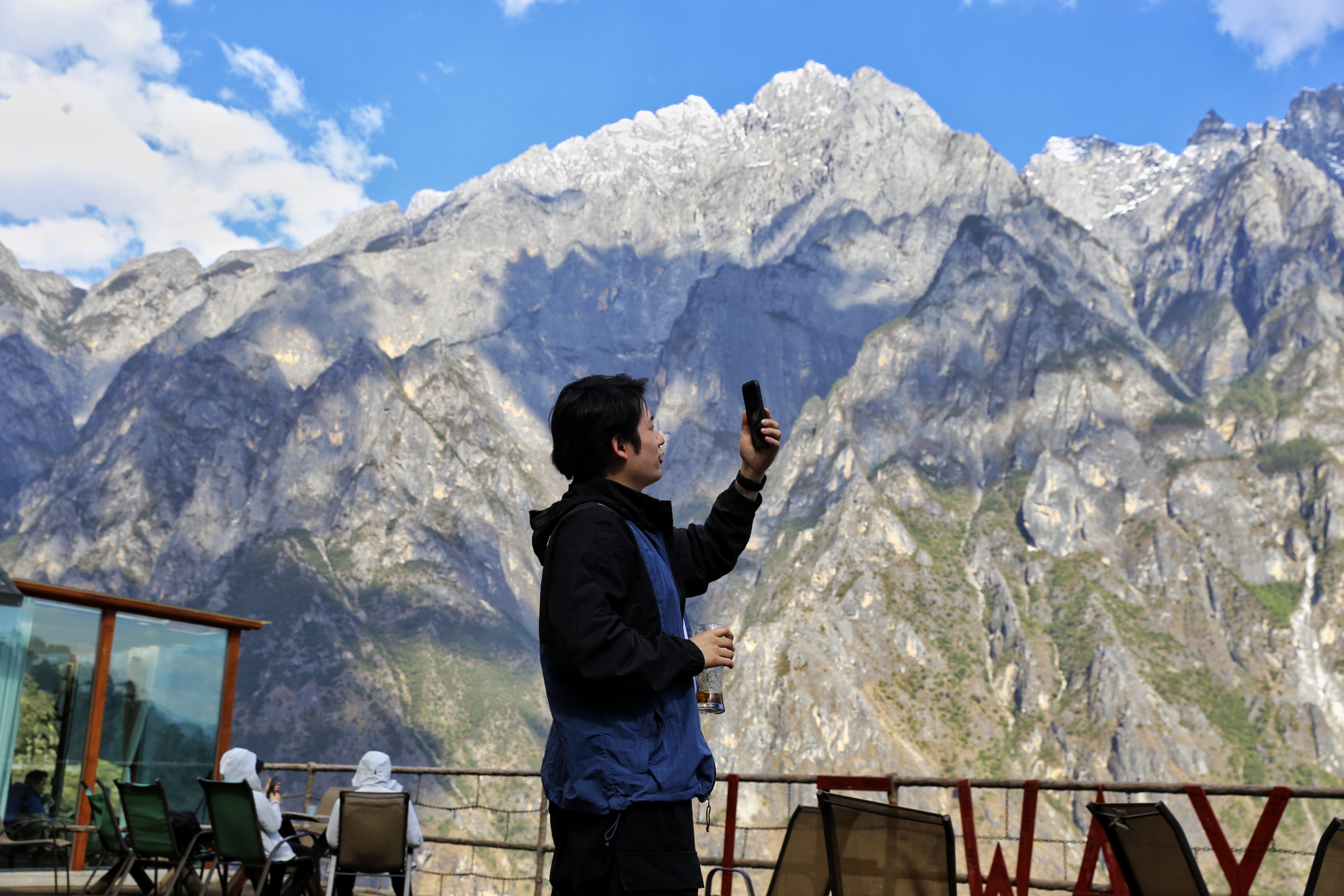 5月17日,游客在香格拉里市虎跳峽高路徒步線路中途客棧小憩,欣賞雪山峽谷壯美景色?;⑻鴯{高路徒步路線為“世界十大經(jīng)典徒步路線之一”,全長(zhǎng)20公里左右,該路線以險(xiǎn)、奇、秀著稱。路線位于哈巴雪山山麓,腳下金沙江水奔涌而過(guò),對(duì)岸是聳立入云的玉龍雪山,一路叢林、峽谷、古道、瀑布等景色美不勝收,每年吸引著數(shù)萬(wàn)名國(guó)內(nèi)外的驢友來(lái)此徒步。