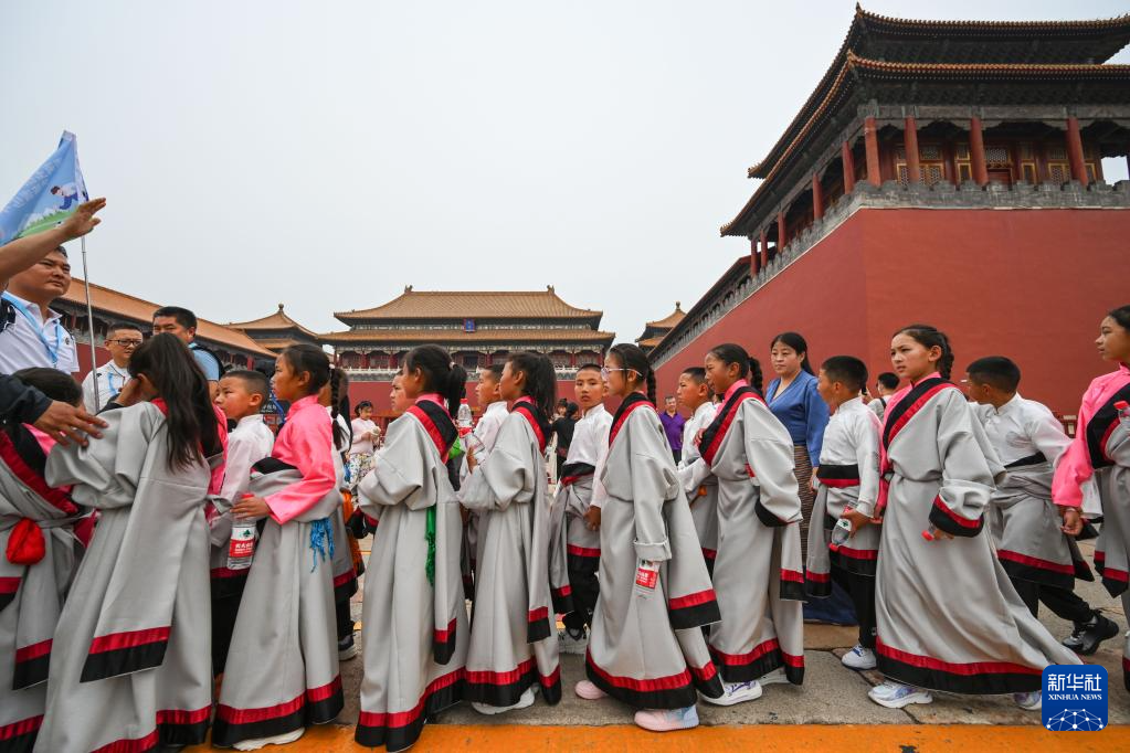 5月31日,來自青海省玉樹州的孩子們?cè)诒本┕蕦m博物院外排隊(duì)等候進(jìn)入?yún)⒂^。新華社記者 陳曄華 攝