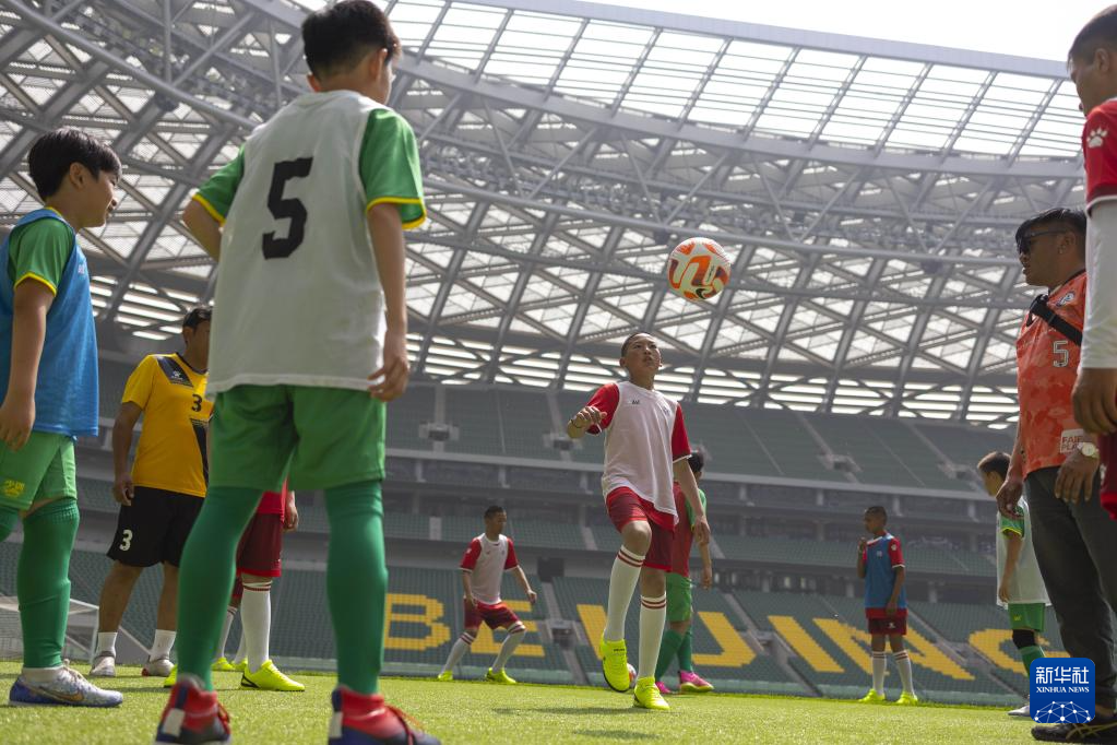 6月1日,在北京工人體育場(chǎng),藏族孩子與國(guó)安少年足球隊(duì)隊(duì)員訓(xùn)練交流。新華社記者 才揚(yáng) 攝