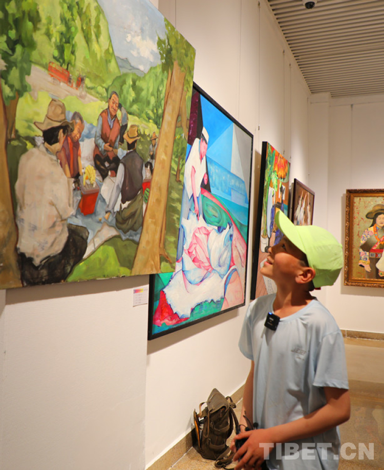孩子們尤其喜歡美術(shù)館,對(duì)色彩斑斕的畫(huà)作興趣更大。五年級(jí)的公卻西然指著一幅藏族群眾過(guò)林卡的畫(huà)作做介紹,“這是人們?cè)诠珗@里野餐。我們喜歡這樣的活動(dòng)?!?/span>聽(tīng)隨團(tuán)的老師介紹,在玉樹(shù),到了夏天也會(huì)常帶孩子們?nèi)ヒ安屯嫠?。吃著零食、在?shù)蔭下或玩游戲或打鬧說(shuō)笑,實(shí)在太愜意了。