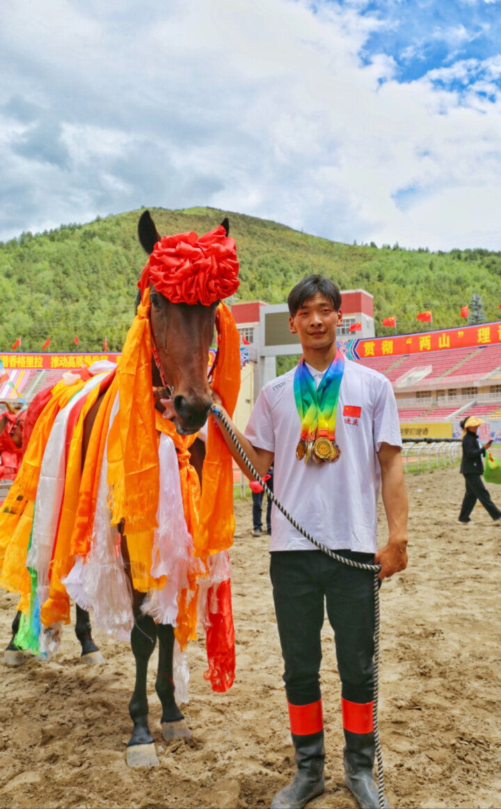 三天來,香格里拉五鳳山賽馬場(chǎng)內(nèi)人頭攢動(dòng),熱鬧非凡,州內(nèi)各族群眾和游客從四面八方聚集而來,為三年未能出現(xiàn)在香格里拉端午賽馬現(xiàn)場(chǎng)的駿馬和騎手們搖旗吶喊、加油助威,而來自州內(nèi)及友鄰州市的各代表隊(duì)則不負(fù)眾望,為大家呈現(xiàn)了一場(chǎng)場(chǎng)熱血沸騰的高水平馬術(shù)競(jìng)技?!拔覐?5歲開始參加比賽,今年是收獲最大的一次,連獲了4枚金牌,我很高興,期待明年的端午節(jié)能再次與來自不同地方的選手切磋?!?3歲的知詩(shī)定主說道。此次,他獲得了甲組1000米走馬、甲組3000米走馬、乙組3000米走馬、丙組1000米走馬賽冠軍。與他并駕齊驅(qū)的嘎提七林則在甲組5000米速度賽、丙組5000米速度賽、甲組3000米速度賽、乙組3000米速度賽中獲得金牌。