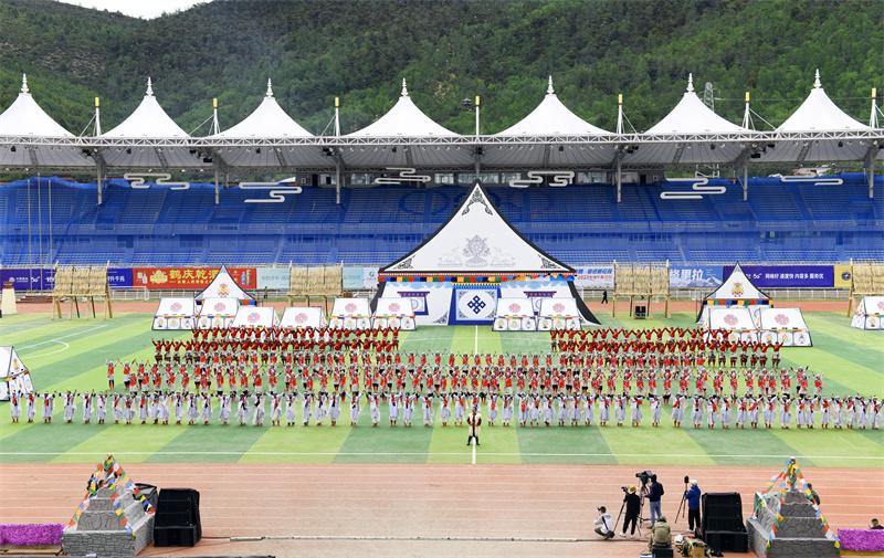 上午10時,活動在萬眾期待中正式拉開序幕,伴隨著禮炮和陣陣馬蹄聲運動員有序入場。隨后,莊嚴肅穆的旋律響起,全場起立舉行升國旗儀式,共唱中華人民共和國國歌。