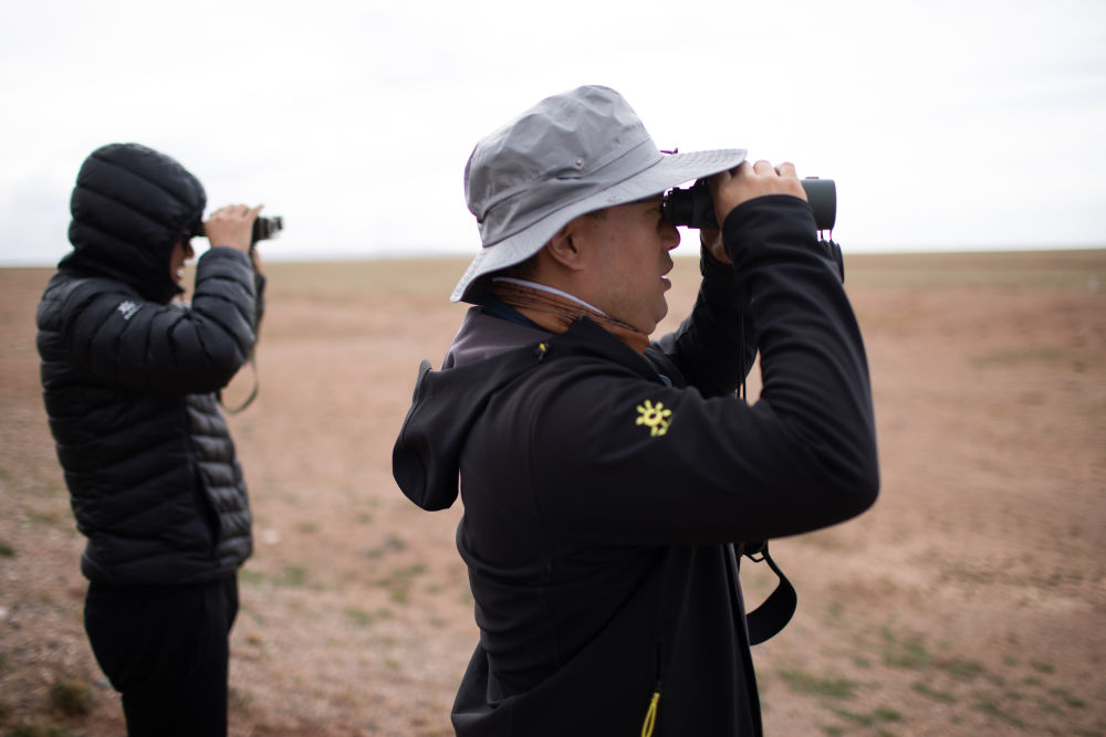 6月15日,連新明(右)和王東在可可西里用望遠(yuǎn)鏡觀察藏羚羊遷徙情況。