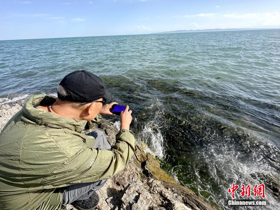 圖為游客在青海湖斷崖湟魚密集處留影。李雋 攝
