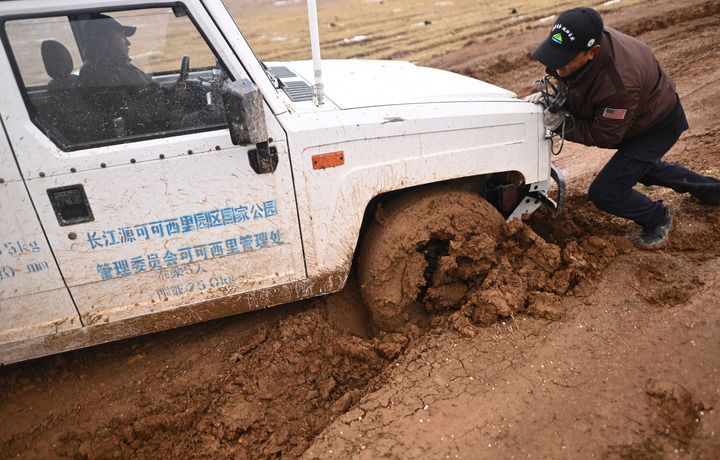 正值夏天,可可西里原本的凍土和沼澤融化成一個個爛泥灘。絞盤斷了、千斤頂壞了,巡山車輛埋在泥里,動彈不得。