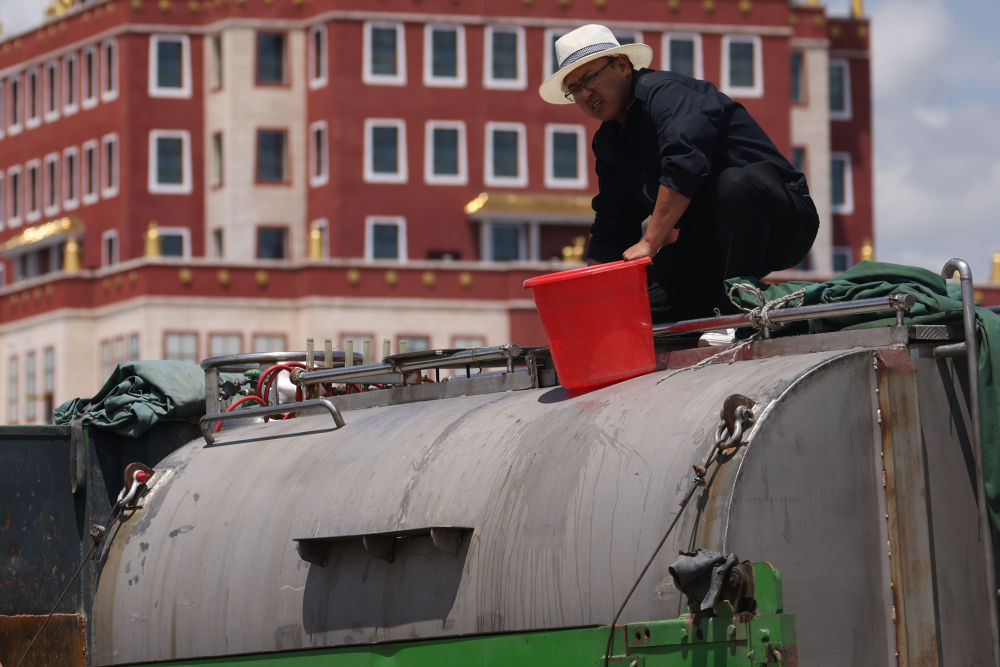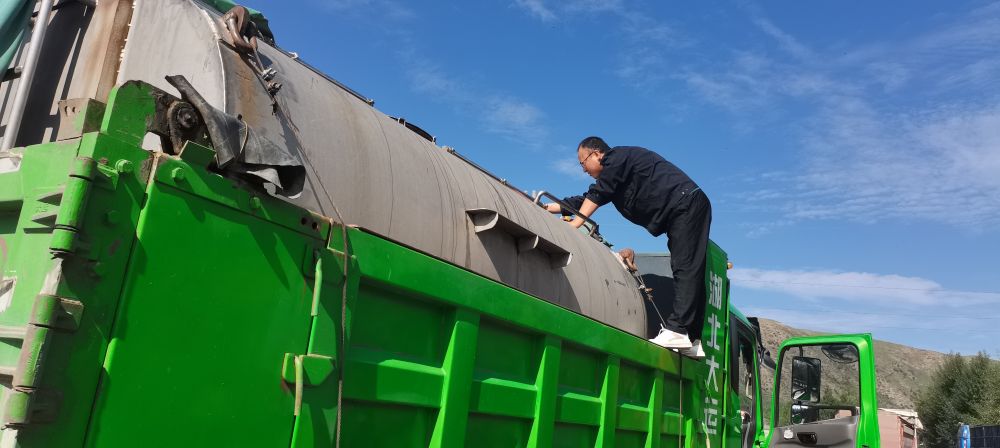 車輛進入一處服務區(qū)后,緩緩停靠在路邊。李瑾翻身跳下車去,爬上4米多高的車頂,打開水箱蓋細細查看,有幾條小魚在水面上游動著,似乎好奇地向外張望。