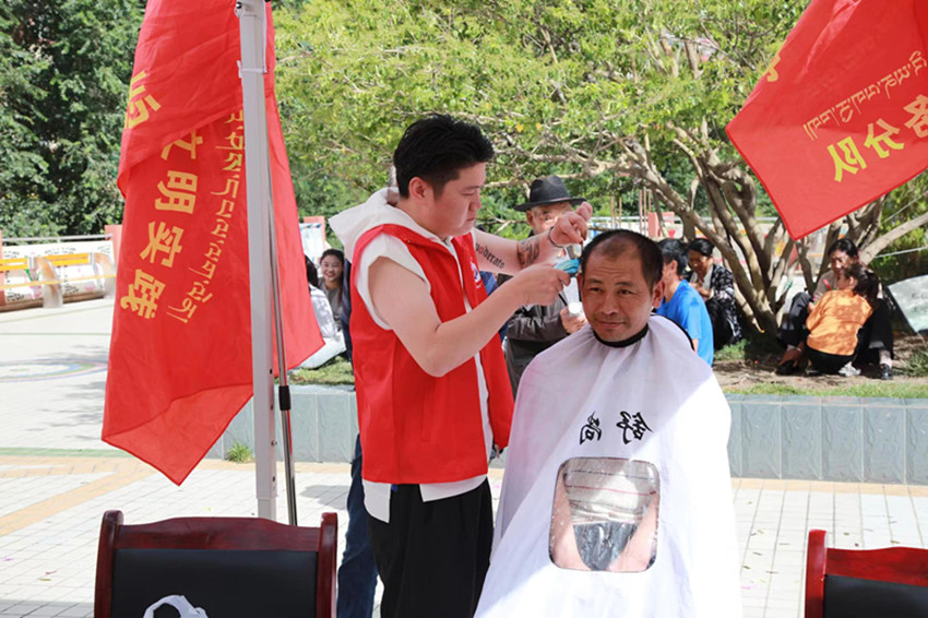 志愿者為群眾義務理發(fā)。