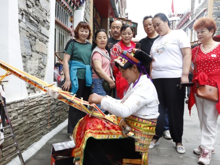 在理縣古爾溝鎮(zhèn)丘地村,54歲的藏族阿媽澤朗斯基端坐家門前,動作嫻熟地操作著傳統(tǒng)腰機,編織一款藏式花腰帶。只見她靈巧的雙手來回推拉木梭,不時變換著經(jīng)線,不一會兒,五彩的絲線就化為明艷動人的吉祥紋樣,在織布上綻放開來。