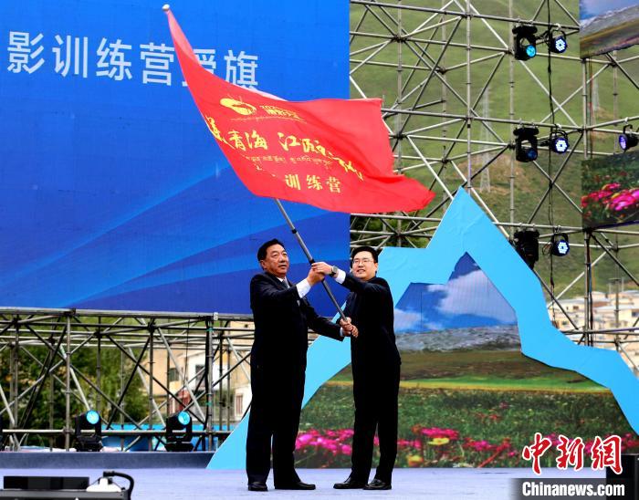 圖為中共玉樹(shù)州委副書記、宣傳部部長(zhǎng)才旦周(左)為此次“大美青海 江源玉樹(shù)”攝影訓(xùn)練營(yíng)授旗。薛蒂攝