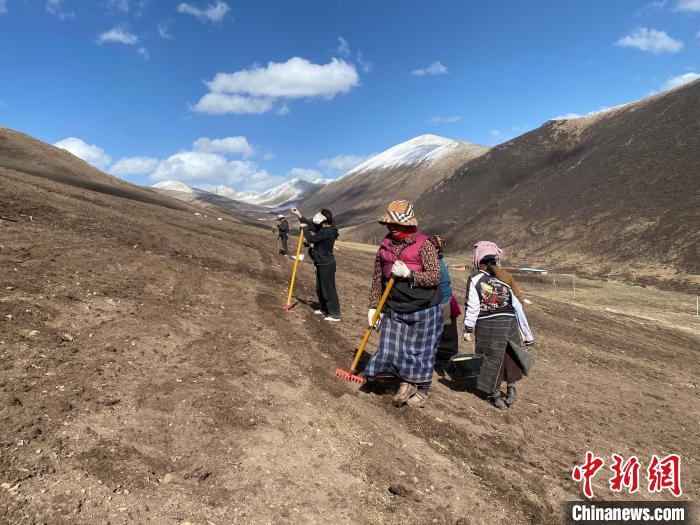 “土壤、植物和動(dòng)物共同組成了完整的‘地球肌膚’系統(tǒng),恢復(fù)黑土灘需要針對(duì)不同生態(tài)層次進(jìn)行科學(xué)治理?!迸砜榻B,本次修復(fù)在今年四月進(jìn)行,首先針對(duì)土壤進(jìn)行淺刨溝、坡向垂直橫向條播,為播種創(chuàng)造合適的土壤條件,再選用披堿草、老芒麥、中華羊茅、冷地早熟禾、星星草、燕麥、紫羊茅7種本地草種,進(jìn)行比例混合,再為種子覆土,以有利于保持種子不被風(fēng)吹、流失和鳥類“偷吃”,穩(wěn)定恢復(fù)植被生長(zhǎng)。