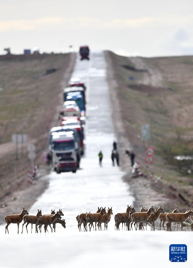7月28日,一群藏羚羊通過青藏公路前往三江源地區(qū)的棲息地。 新華社記者 張宏祥 攝