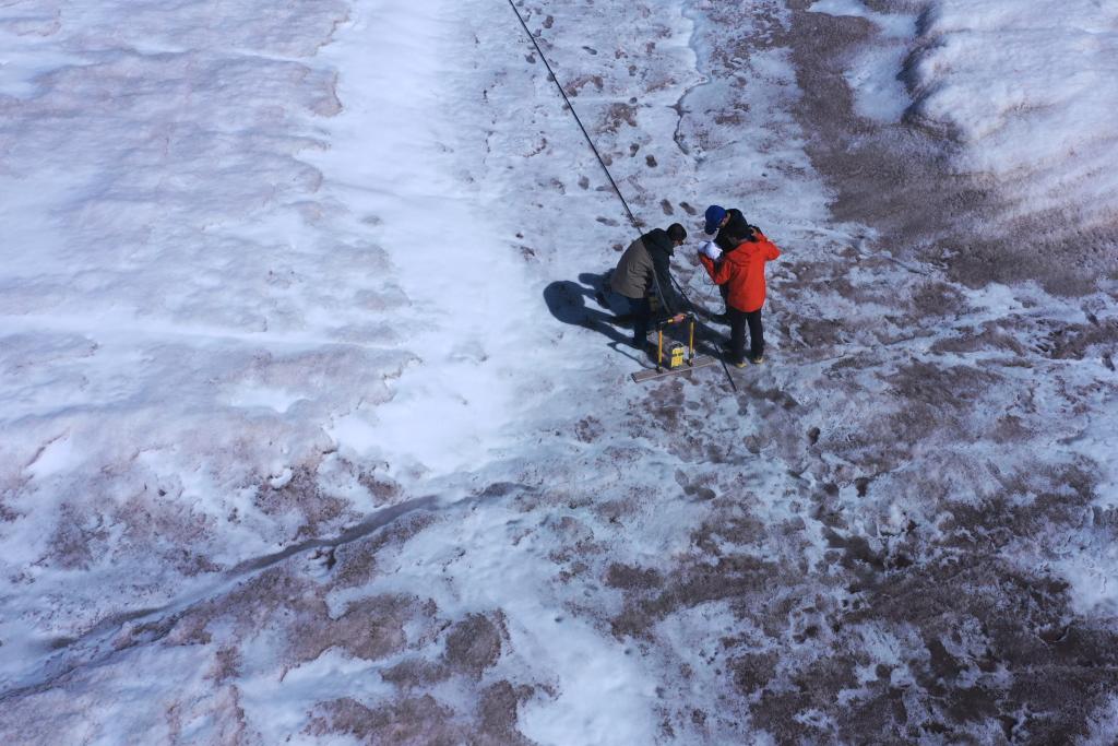 7月27日,范越(左一)和董士琦(左二)在長江源區(qū)的冬克瑪?shù)妆ㄉ鲜褂玫刭|(zhì)雷達(dá)探測冰川厚度(無人機(jī)照片)。新華社記者 陳杰 攝