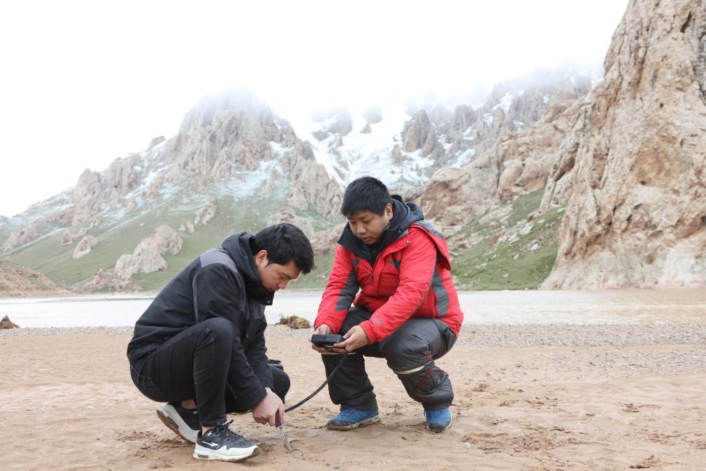 科考隊(duì)員洪曉峰(右)與宋基權(quán)在長江源區(qū)進(jìn)行土壤溫濕度觀測(cè)。新華社記者 劉詩平 攝