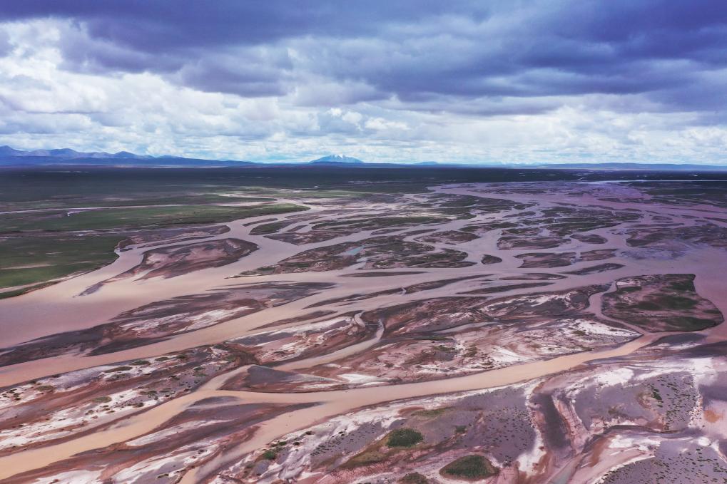 這是2023年7月26日拍攝的囊極巴隴河道,長江正源沱沱河和南源當(dāng)曲在此匯合(無人機(jī)照片)。新華社記者 陳杰 攝