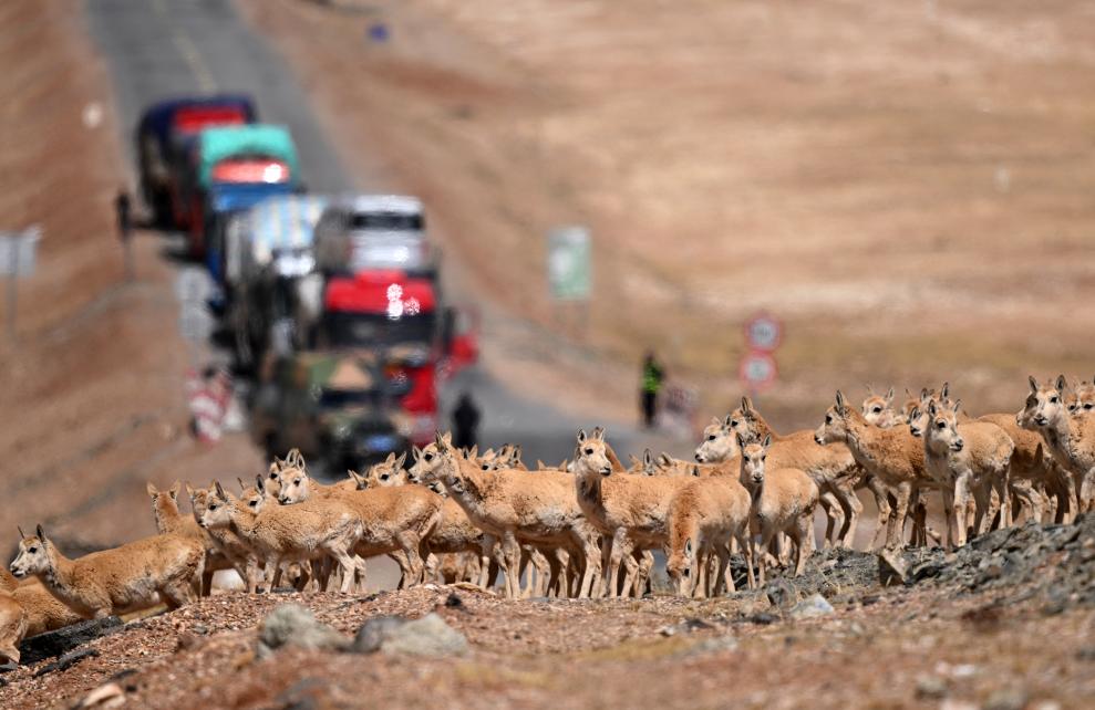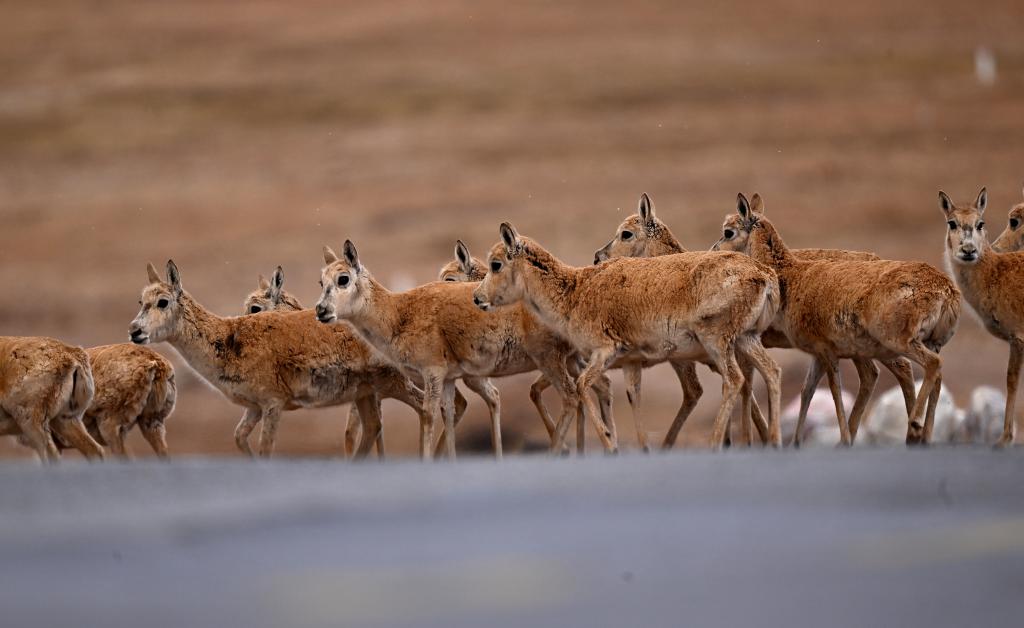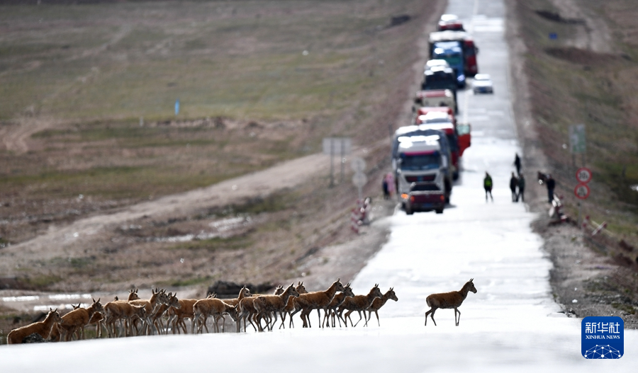 一群待產(chǎn)雌性藏羚羊在通過(guò)青藏公路前往可可西里卓乃湖產(chǎn)仔(5月28日攝)。新華社記者 張宏祥 攝