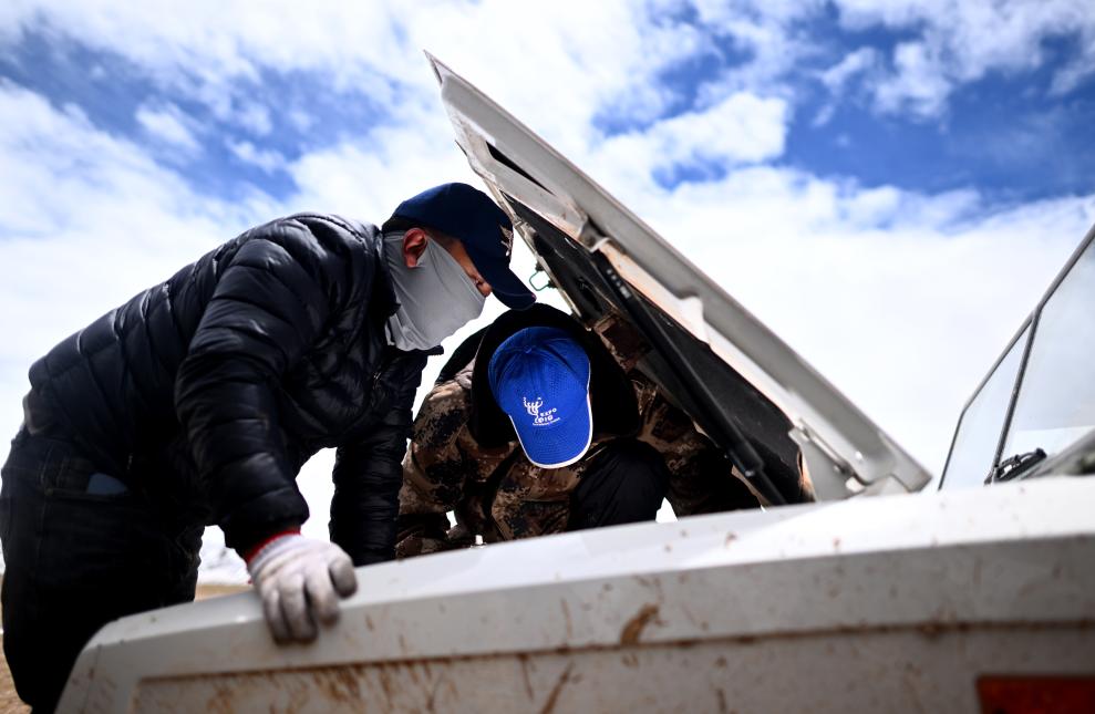 在前往卓乃湖保護(hù)站的途中,可可西里管理處卓乃湖保護(hù)站隊(duì)員才索加(左)和隊(duì)友在維修出現(xiàn)故障的車(chē)輛(6月16日攝)。新華社記者 張宏祥 攝