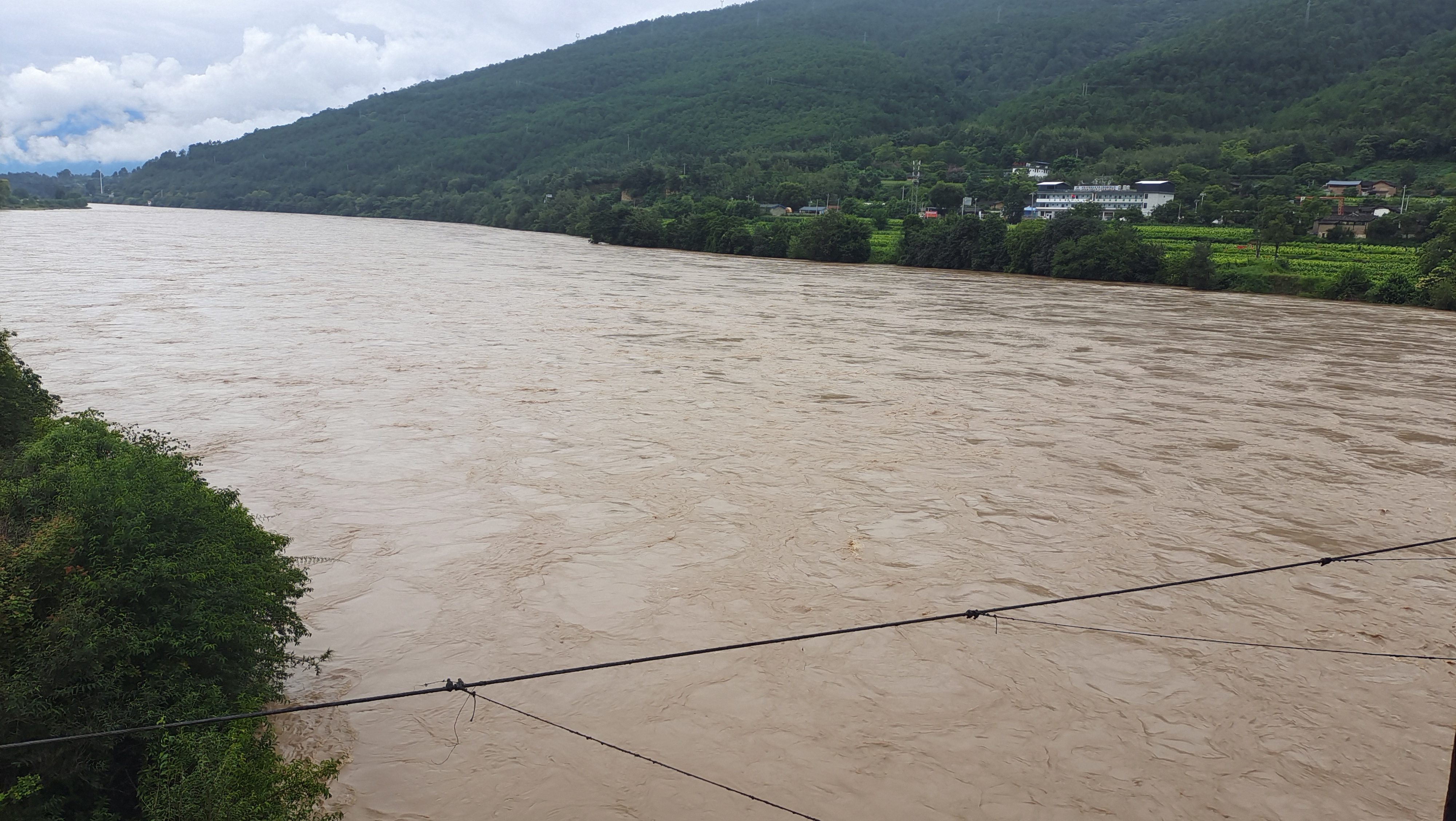 監(jiān)測數(shù)據(jù)顯示,8月21日15時(shí)下游金江鎮(zhèn)水文站水位1823.59米,超警戒1.09米,相應(yīng)流量每秒4950立方米。隨著持續(xù)降水過程,金沙江水位持續(xù)上升,上江鄉(xiāng)至金江鎮(zhèn)臨江一線水位已逼近農(nóng)田,江水已沒過低洼地帶的楊柳林。