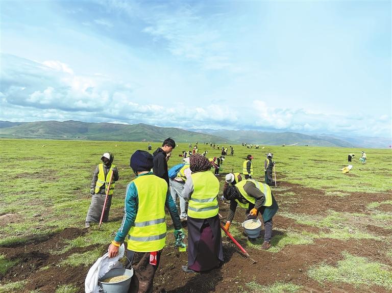 “瑪曲縣地處青藏高原,由于海拔高、氣候寒冷、植物生長期短、自然條件嚴酷等原因,可借鑒的沙化治理技術(shù)措施少,導(dǎo)致沙化治理難度大?!爆斍h草原工作站站長楊林平告訴記者,經(jīng)過多年的試驗、示范和總結(jié),瑪曲縣探索出了一套適合當?shù)氐摹罢?植灌+草方格+施肥+土質(zhì)改良+人工種草+圍欄”的沙丘治理技術(shù)模式,目前對已形成的沙化土地和黑土灘退化草地等進行重點治理,成效顯著。