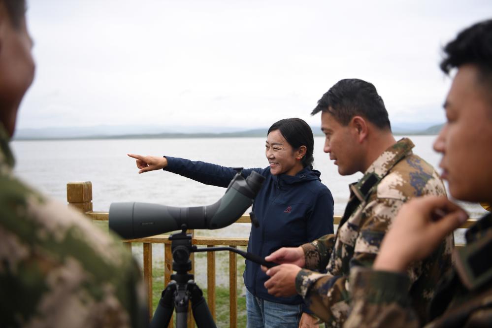 甘肅尕海則岔國家級自然保護(hù)區(qū)管護(hù)中心尕海保護(hù)站站長香毛吉(左一)向游客介紹保護(hù)區(qū)的野生動(dòng)植物情況。 新華社記者 陳斌 攝