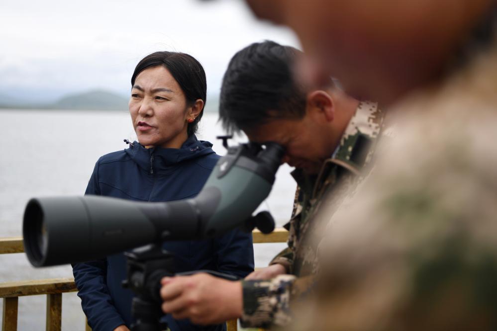 甘肅尕海則岔國家級自然保護(hù)區(qū)管護(hù)中心尕海保護(hù)站站長香毛吉(左一)和同事在保護(hù)區(qū)內(nèi)用望遠(yuǎn)鏡觀測野生動(dòng)物。 新華社記者 陳斌 攝